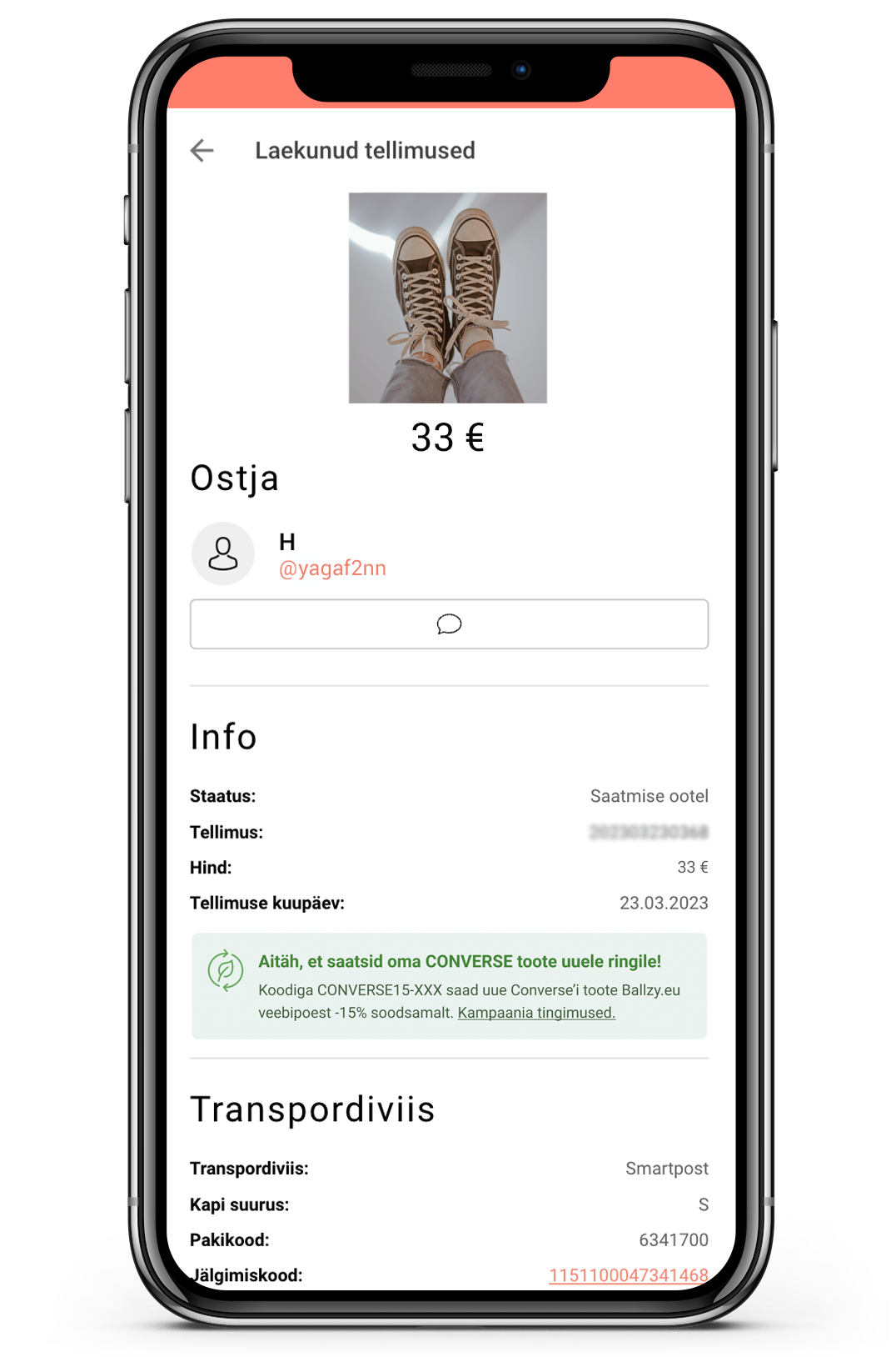 Kui toode on leidnud ostja, saab müüja unikaalse sooduskoodi, millega on võimalik Ballzy.eu lehelt uus Converse’i toode -15% soodustusega soetada